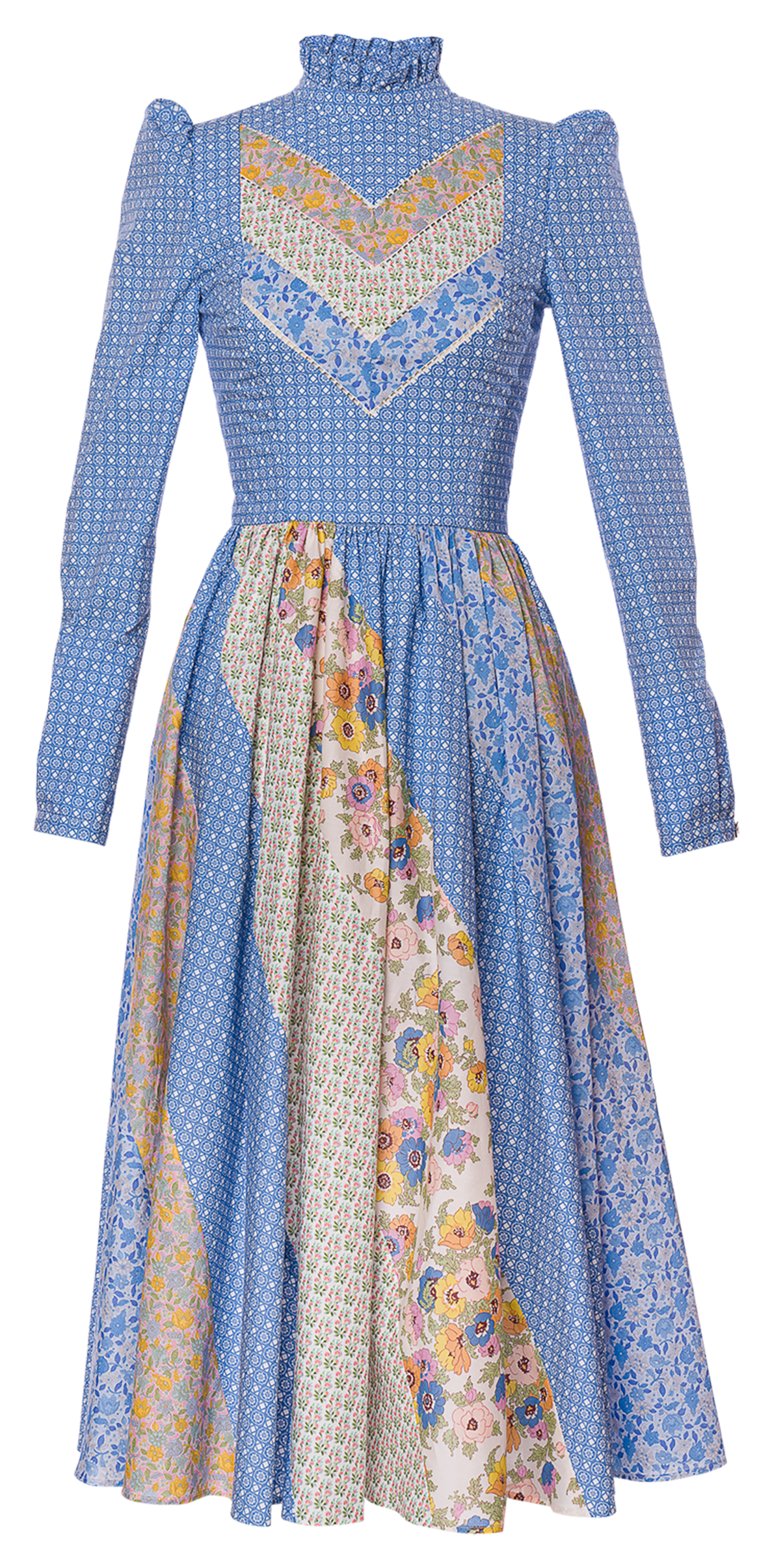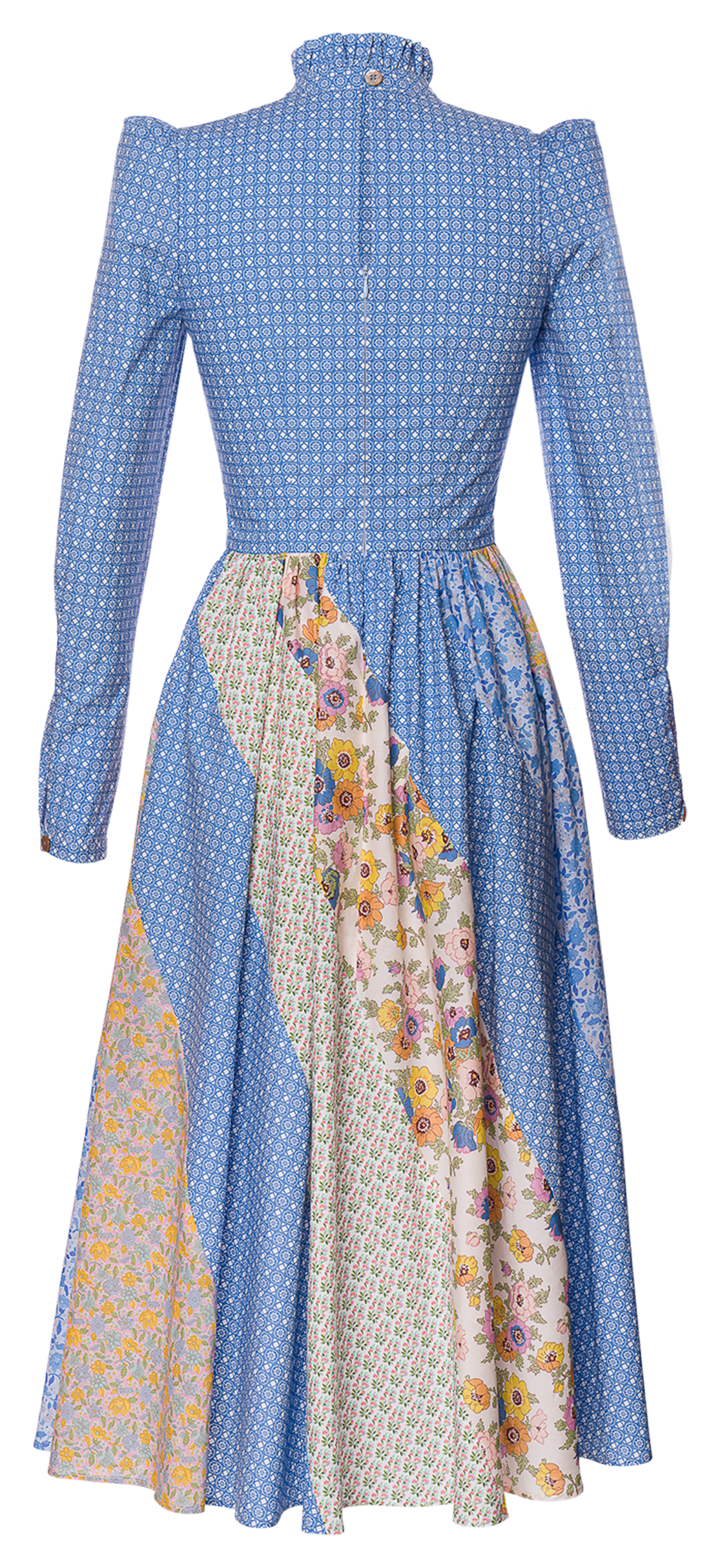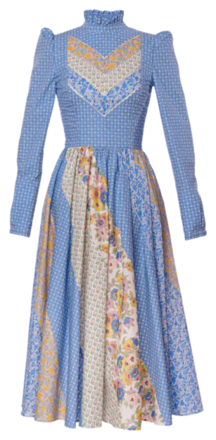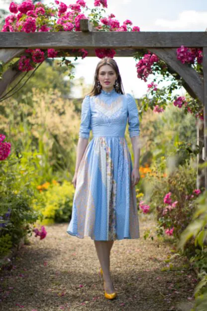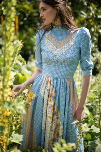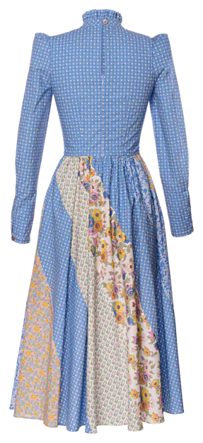 Das "Vanderbilt" Kleid von Lena Hoschek in delphinium hebt sich durch seine auffälligen Patchwork-Elemente und dem hochgeschlossenen Schnitt hervor. Lange Puffärmel und ein hochgeschlossener Kragen sorgen für einen eleganten Look, während der Reißverschluss in der Rückenmitte eine perfekte Passform garantiert. Patchwork-Elemente am Rock und auf der Brust setzen stilvolle Akzente, und dezente Rüschen am Hals verleihen dem Kleid eine feine, romantische Note. Aus 100% Baumwolle gefertigt, bietet dieses Kleid sowohl Komfort als auch Raffinesse.