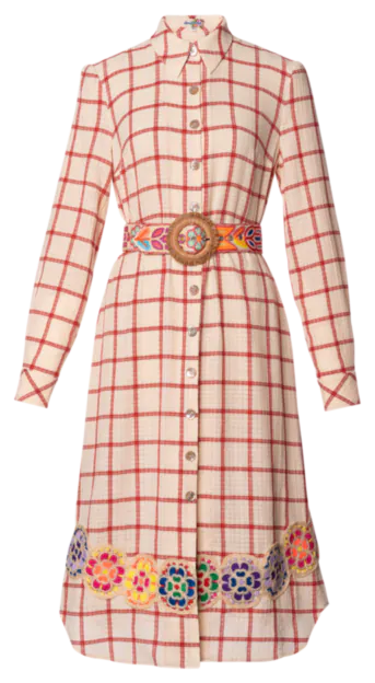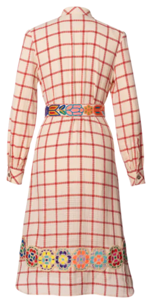 Das "Molly" Kleid in der Farbe picnic von Lena Hoschek besticht durch seine charmante, florale Borte. Ein creme-rotes Karo-Muster und die durchgehende Knopfleiste unterstreichen das klassische Hemdblusenkleid, während lange Ärmel und Perlmuttknöpfe für eleganten Komfort sorgen. Die Bastschnalle und die Borten am Saum sowie am Gürtel verleihen dem Kleid aus 100% Baumwolle eine zusätzliche Note. Dieses Sommerkleid ist die ideale Wahl für entspannte, sonnige Tage.