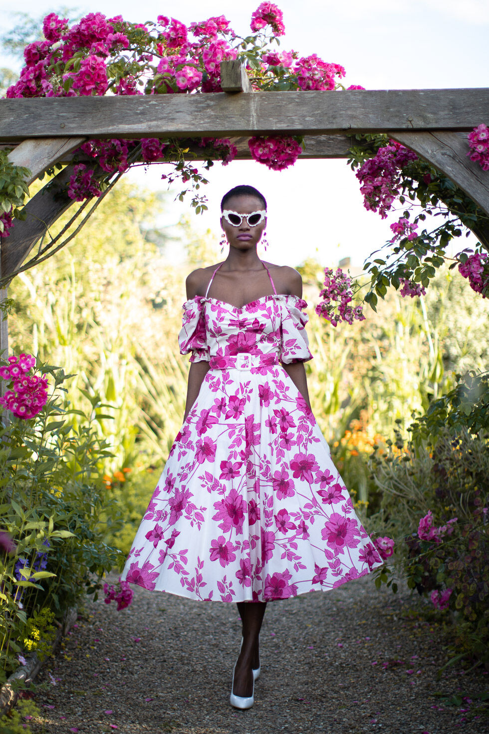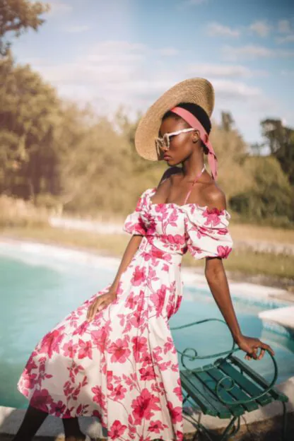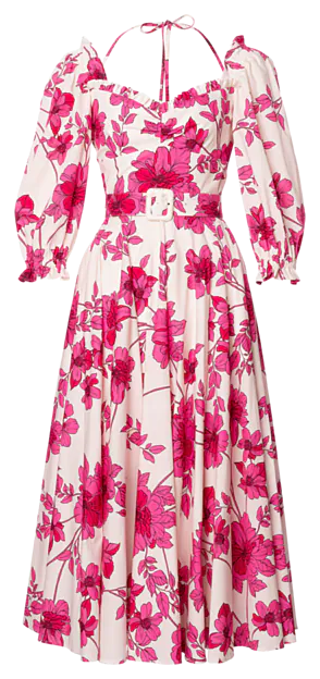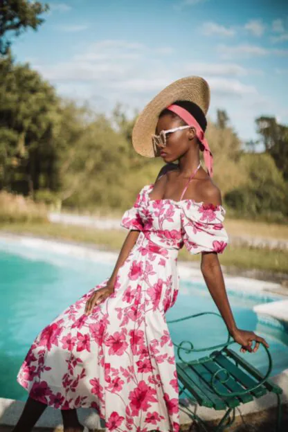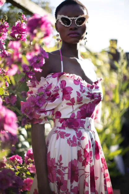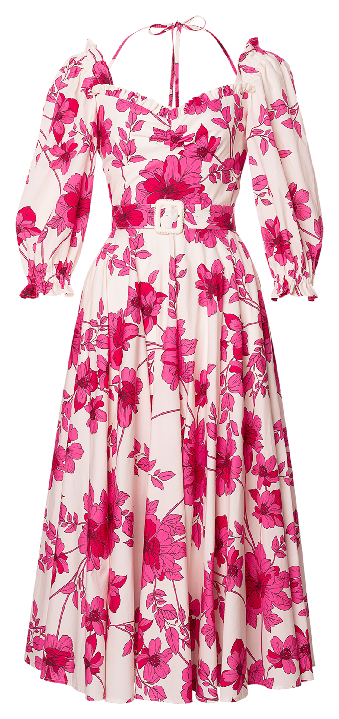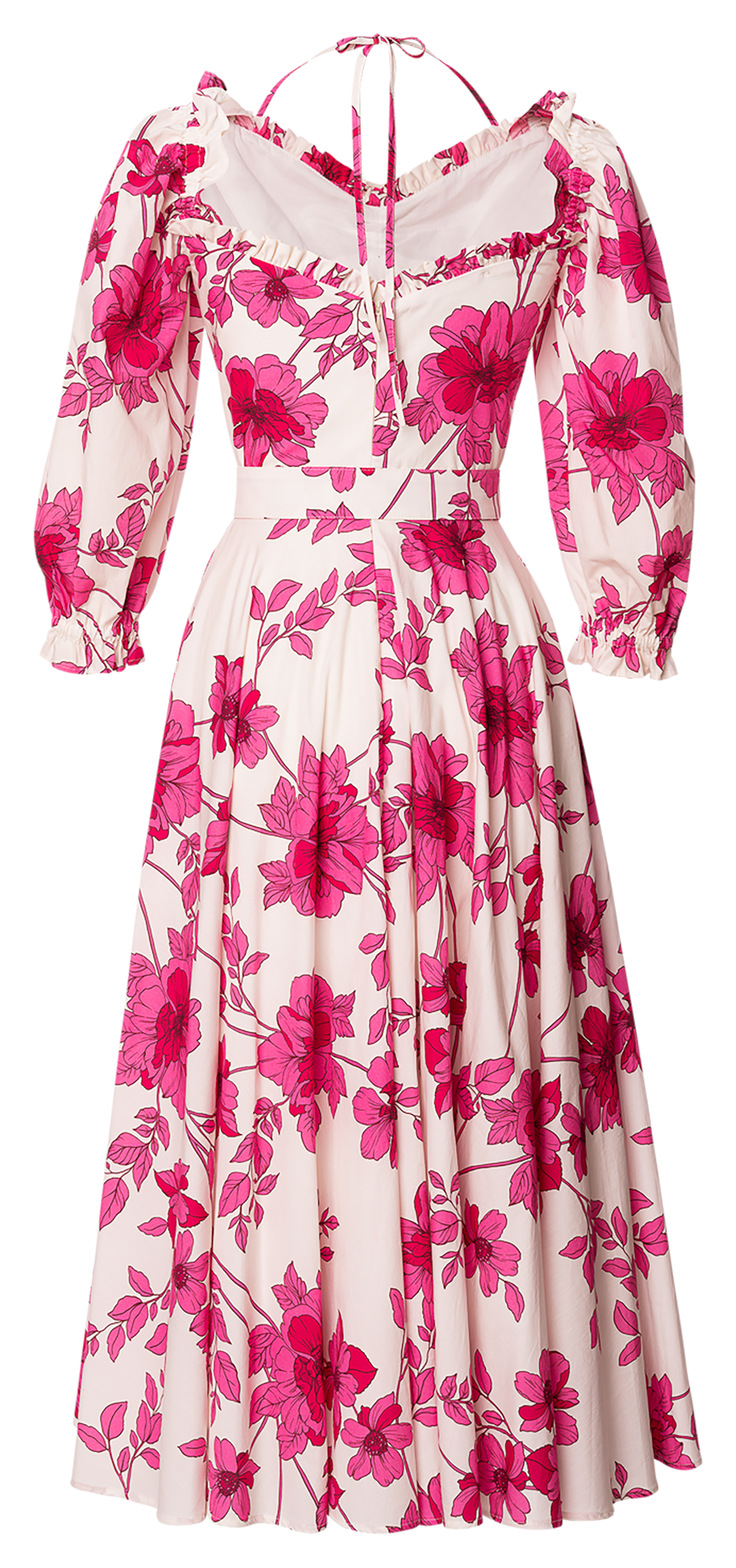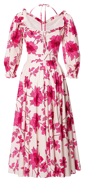 The "Angelique" dress in peony by Lena Hoschek showcases a delightful blend of playful charm and romantic details within an elegant design. Made from soft cotton, it features a halter neck style in a midi length. Three-quarter puff sleeves with elastic at the shoulders and a heart-shaped neckline with ruffle embellishments add a feminine touch. Hidden side pockets, a practical back zipper, and a fabric-covered belt with a raffia buckle complete the sophisticated look.