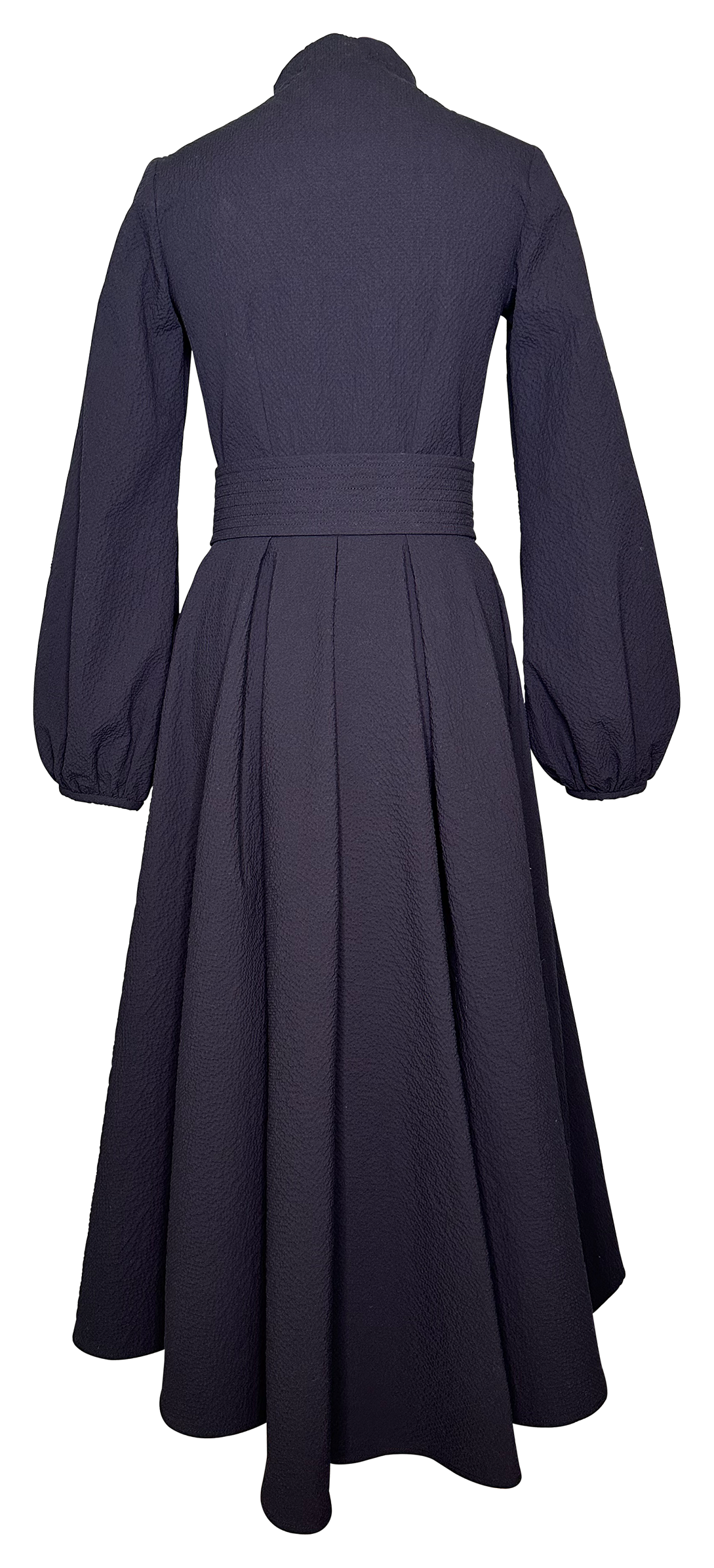 The "Eleanor" coat in color night by Lena Hoschek is the perfect addition to your summer wardrobe. Crafted from light seersucker, this unlined jacket offers a breezy, relaxed fit. Covered buttons and the attached stand collar add an elegant touch. The wide sleeves and the matching fabric belt with a cord buckle accentuate the tailored, figure-flattering silhouette. Featuring side seam pockets and playful pleats at the hem, this coat combines stylish details with summer lightness.