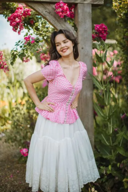 The "Lovelorn" blouse in the colour popsicle by Lena Hoschek in a white and pink check design stands out with its special details. One highlight is the hook fastening, which adds an elegant touch. Cut rather tightly at the top, the blouse merges into playful ruffles which, together with the puff sleeves, create a feminine silhouette. Perfect for a romantic look.